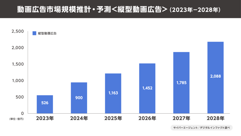 2024年の縦型動画広告市場は前年比171.1%の900億円に達しており、2028年に向けてさらなる成長が確実視されています。