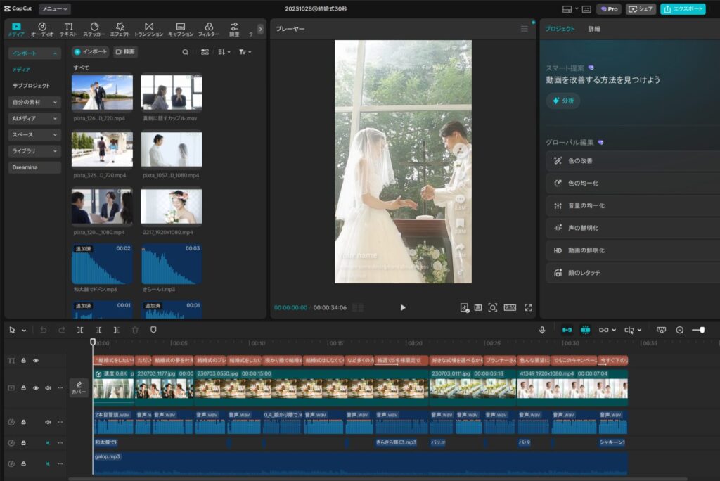 AIを活用した自動編集機能や、豊富なエフェクト・トランジションが用意されており、短時間で見栄えの良い動画を作成できます。