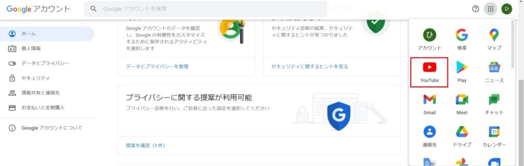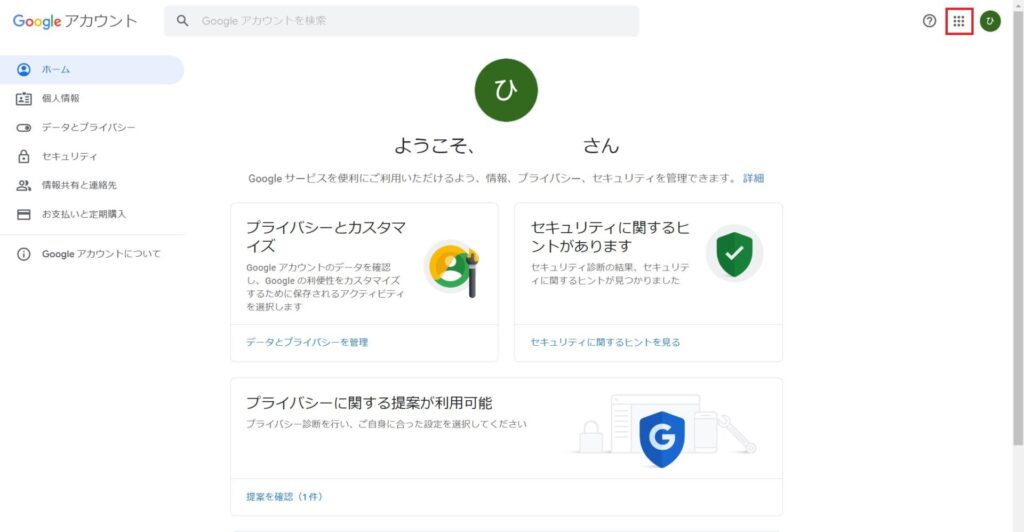 Googleアカウントのホーム画面より、右側のメニューアイコンをクリックします。