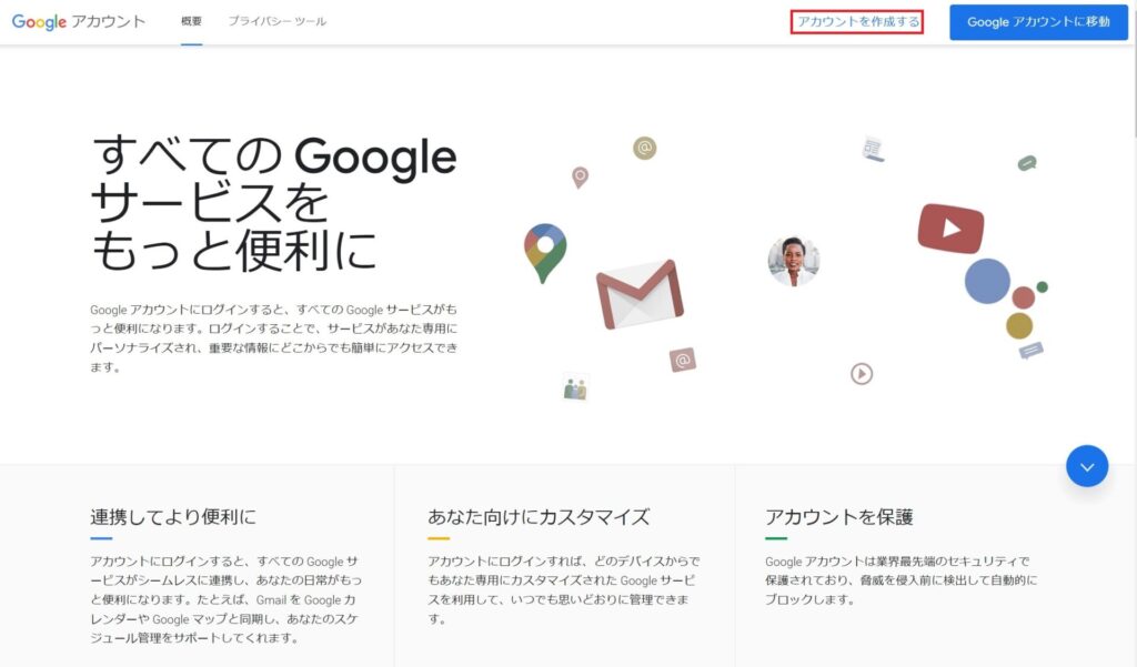 Googleアカウントページを開き、「アカウントを作成する」をクリック。
