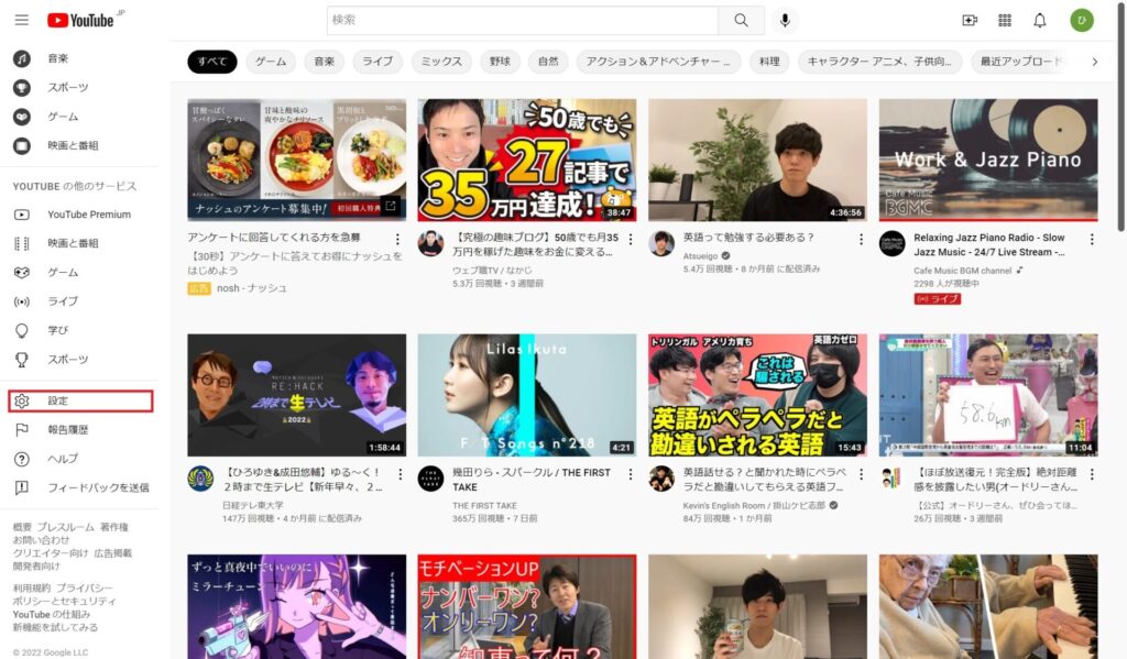 まず、YouTubeのホーム画面より、右側メニューの「設定」をクリックします。