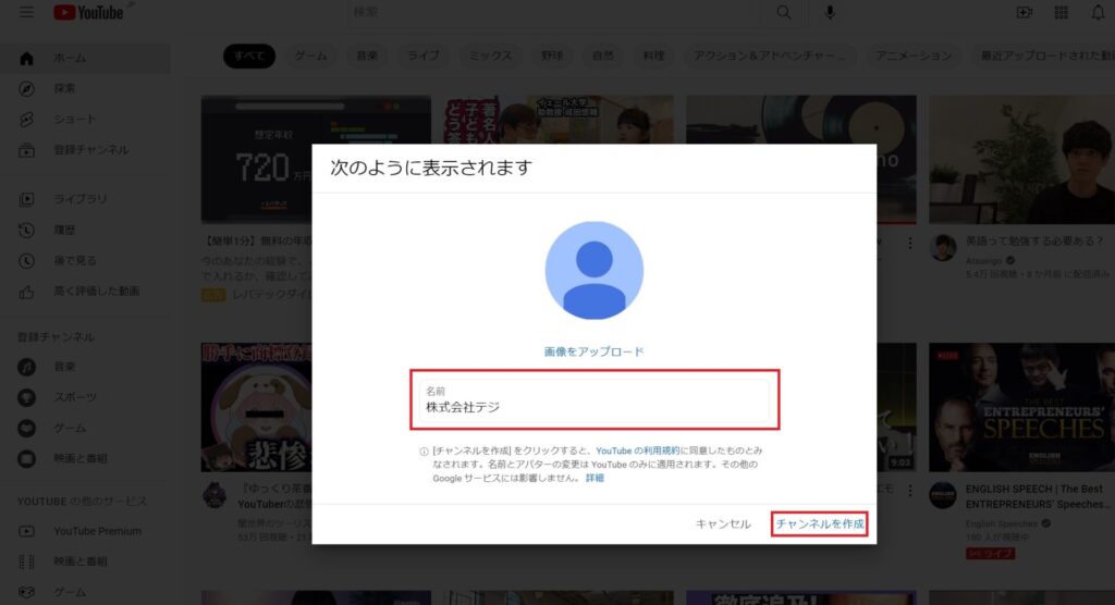 YouTubeチャンネルは、初期状態ですとGoogleアカウント作成時の本名が表示されてしまうため注意が必要です。